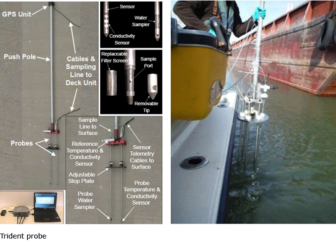 The Trident probe is a direct-push, integrated temperature sensor, conductivity sensor, grain-size sensor and porewater sampler developed to screen sites for areas where groundwater may be discharging to a surface water body. Differences in observed conductivity and temperature indicate areas where groundwater discharge is occurring. The integral porewater sampler can be used to rapidly confirm the presence of groundwater constituents and map the subsurface distribution of contaminants of concern.