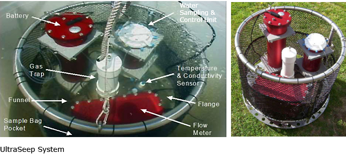 The UltraSeep system is an integrated seepage meter and water sampling system for quantifying discharge rates and chemical loading from groundwater flow to coastal waters. Traditional seepage technology was modified and improved to include automated multiple sample collection and continuous flow detection with ultrasonic flow meters. The UltraSeep makes direct measurements of advective flux and contaminant concentration at a particular location.